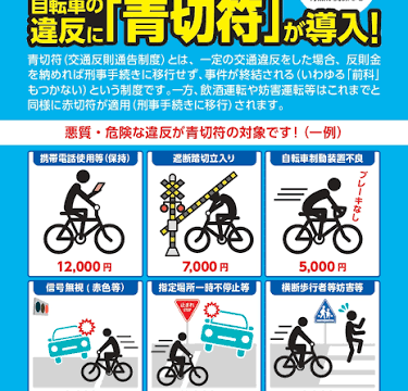 はじめに4月と言えば入学式や、新年度といった始まりの季節です。これから、自転車の交通違反への交通反則通告制度(青切符)が4月1日から始まろうとしています。青切符とはどのような制度で、どういう違反が対象になるのか。おそらく基本的な違反内容は変...